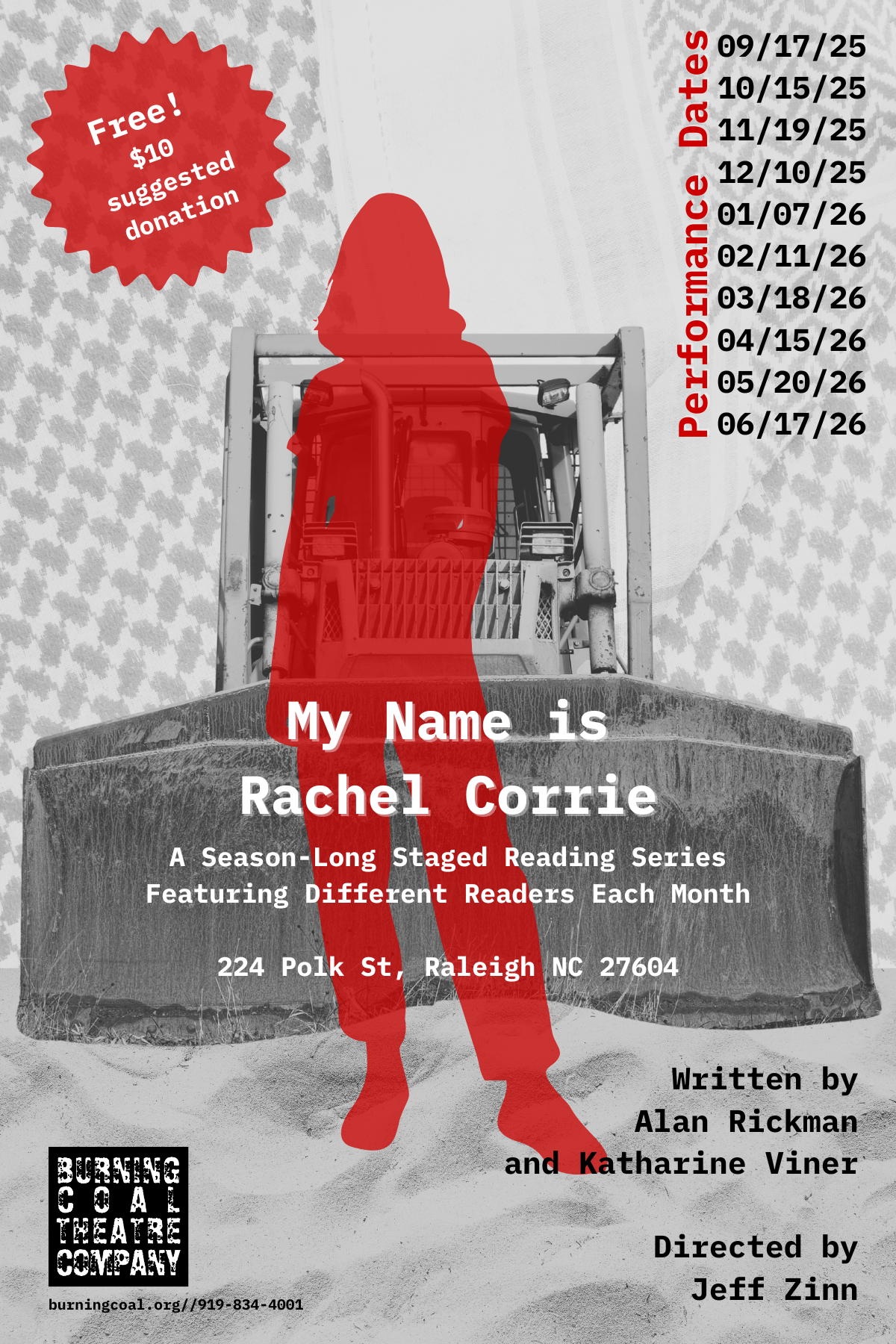 My Name is Rachel Corrie is based on the diary and emails of the young American Activist Rachel Corrie. Rachel decided to put her body in jeopardy by travelling to the West Bank in Israel to stand in front of bulldozers attempting to raise a Palestinian neighborhood in order to build illegal ‘settlements’ for Israelis. She was run over by a bulldozer operated by an Israeli Defense Forces soldier and killed. My Name Is Rachel Corrie is the story of one American who stood up for her values and for the rights of a people for whom she had no connection other than the connection of being human.